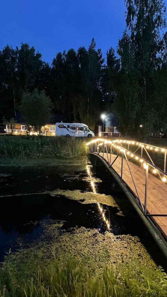 Стоянка автодома только при условии аренды беседки с зоной барбекю. В беседке есть свет и электричество. Недалеко от беседки есть туалет. При въезде на территорию есть сливной канализационный люк, чуть выше есть кран для пополнения запасов питьевой воды.